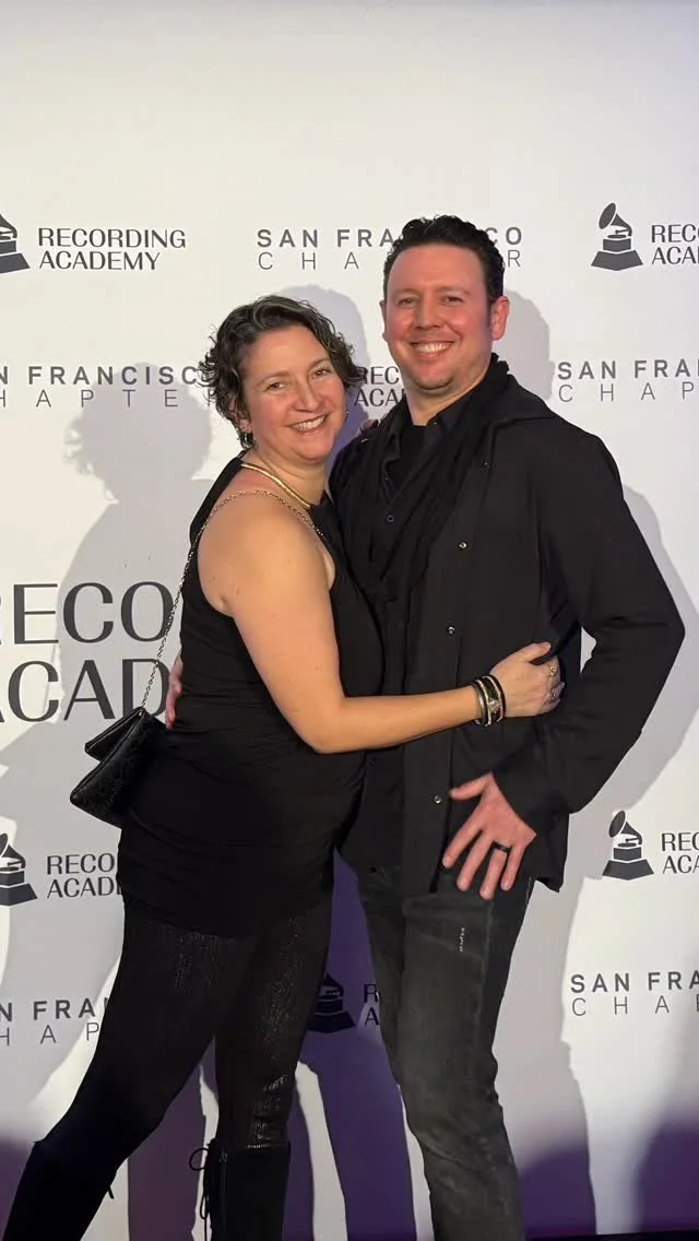 A woman and a man smiling for a photo in a room with audio equipment and screens in the background.
