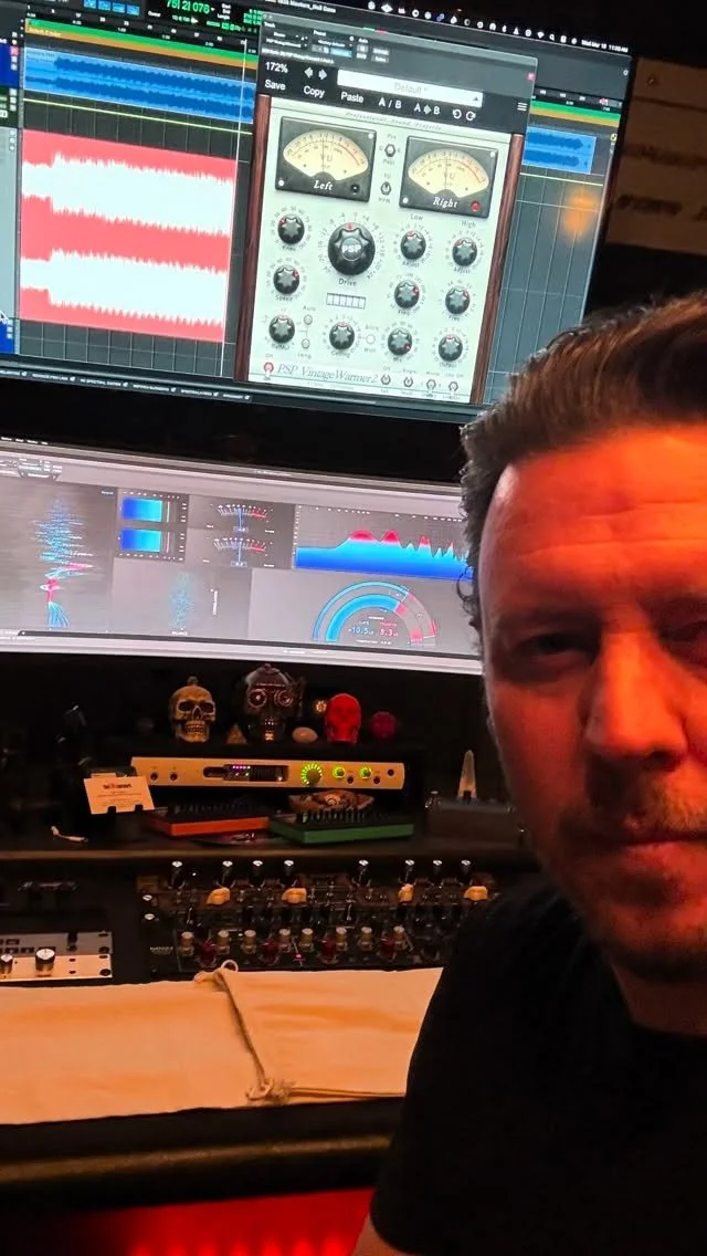 A person taking a selfie in a music production studio with a large computer monitor displaying audio editing software. The desk holds audio equipment, a skull decoration, and a notebook.