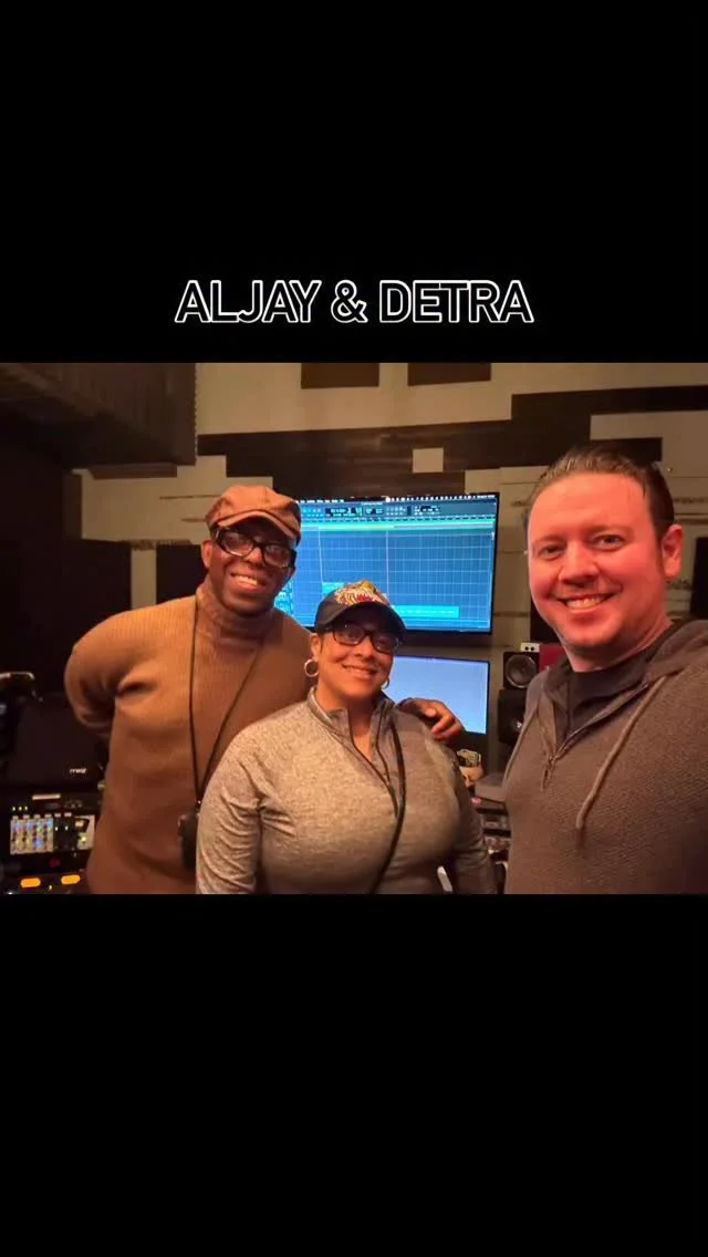 A man smiling while recording vocals in a music studio, wearing a gray basketball shirt with 'GOLDEN STATE BASKETBALL' printed on it, and headphones over his ears. Microphones and soundproofing are visible in the background.