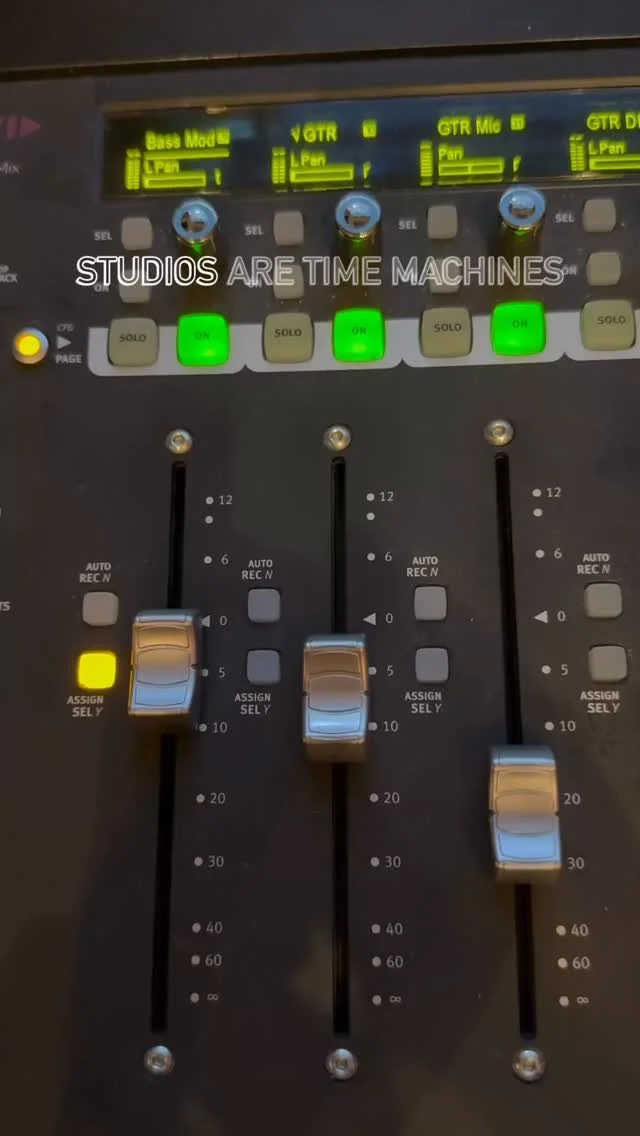 A person in a recording studio sitting in front of a mixing console with a large computer monitor displaying music editing software. The studio has various speakers, microphones, and audio equipment, with warm lighting and a window reflecting colorfu