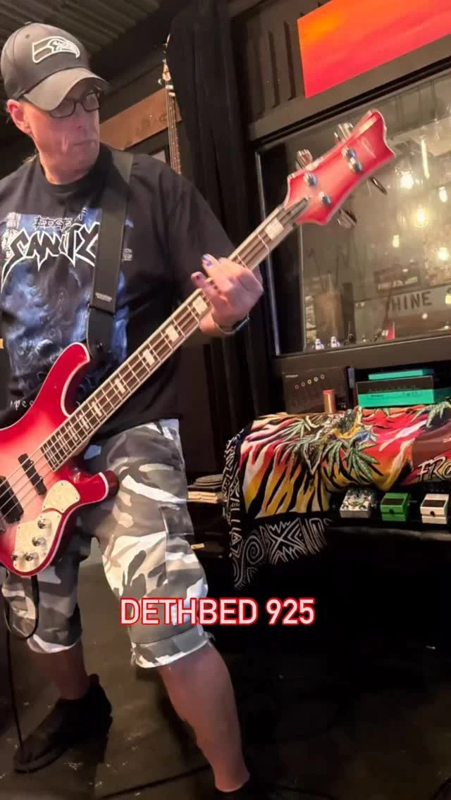 A man with curly hair playing an electric bass guitar in a recording studio.
