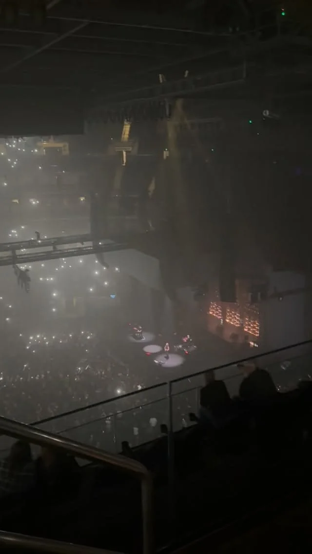 A man with short dark hair and a serious expression taking a selfie in a music venue, with a drummer playing drums in the background. The venue has vintage posters, framed pictures, and a sign that says 'Shine On' on the wall.