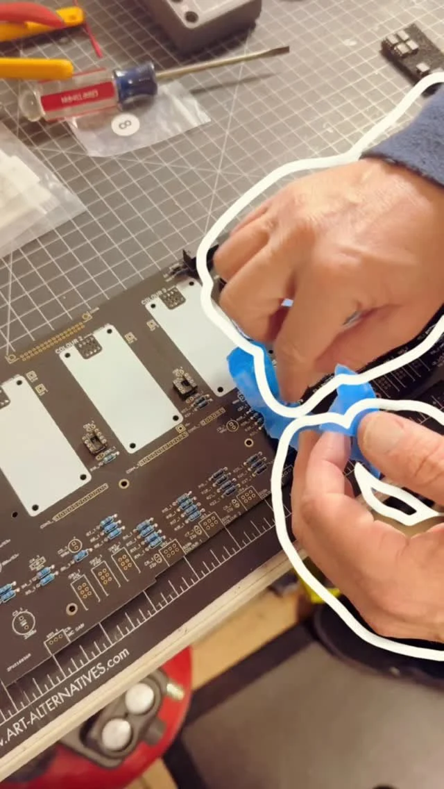 A person wearing a cap and glasses is working at a music production studio with mixing equipment and two computer screens displaying audio tracks and mixing levels.